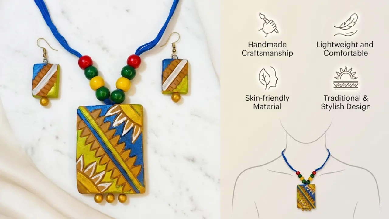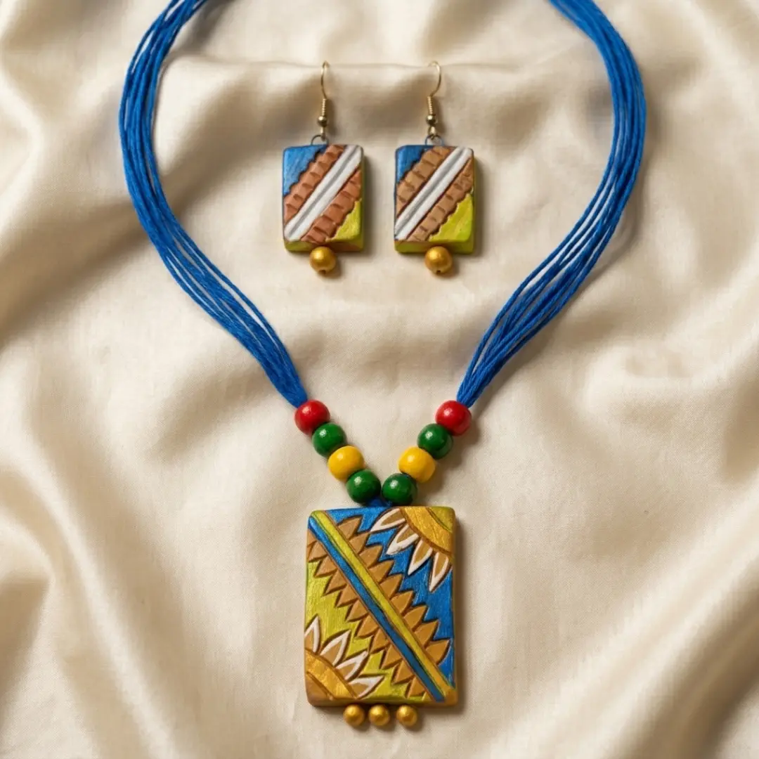 A tribute to ancient earth-craft, this hand-painted terracotta set translates the warmth of the sun into wearable art. Each bead and pendant is meticulously shaped from organic clay and detailed with traditional motifs, offering a weightless yet profound connection to heritage.